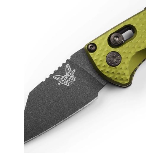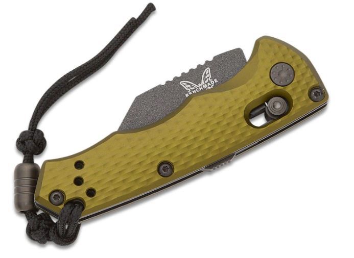 Benchmade Knives 2950BK-2 Partial Immunity: An out-the-side automatic knife with a Wharncliffe blade, Woodland Green aluminum handles, and black Cerakote finish.234+1