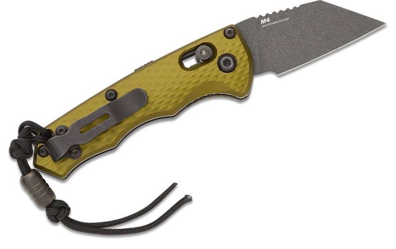 The Benchmade Knives Partial Immunity 2950BK-2 is an out-the-side automatic knife featuring a 1.95" CPM-M4 steel Wharncliffe blade with a black Cerakote finish. It has Woodland Green anodized 6061-T6 aircraft-grade aluminum handles and an ambidextrous stainless steel pocket clip with a lanyard hole. The knife has an overall length of 5.41", a closed length of 3.46", and weighs 2.23oz. It uses the AXIS lock mechanism, which also serves as the automatic opening mechanism. The knife was in stock as of September 14, 2023, at noon EST.23