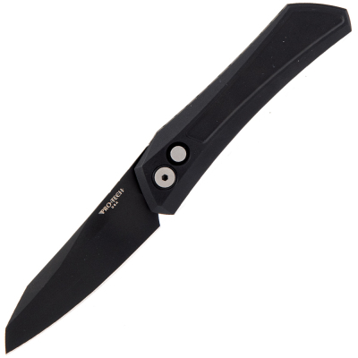 The Protech DS103 Oligarch Auto is an automatic knife designed by Dmitry Sinkevich. It features a black DLC finished Magnacut blade with a black aluminum handle and blasted gray hardware. The knife has a modified sheepsfoot blade profile and an aggressive upper swedge grind, providing both style and performance. It also includes a push button actuator for fast automatic action and a black deep carry clip for right-hand tip-up carry. The knife is made in the USA
