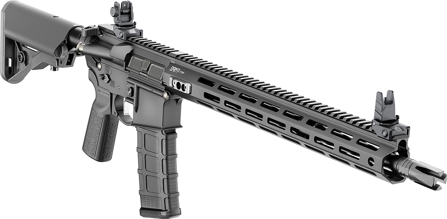 The Saint Victor features a free float aluminum handguard w/SA locking tabs and M-LOK; B5 Systems Enhanced SOPMOD stock; Mil-Spec receiver extension; B5 Systems Type 23 P-Grip; Radian Raptor Ambidextrous charging handle; QD receiver end plate; 45-degree ambidextrous safety; B5 systems polymer trigger guard and a pinned & 4-Prong flash hider. Includes one 30rd Magpul PMAG Gen M3.