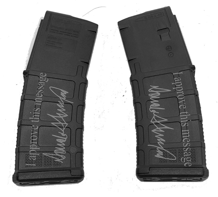 "I approve this message and Trump's Signature custome laser engraved into a made in the U.S.A, the PMAG 30 AR/M4 GEN M3 is a polymer magazine for AR15/M4 compatible weapons. Similar to the MOE PMAG, the GEN M3 features a long-life USGI-spec stainless steel spring for commonality, a four-way anti-tilt follower, constant-curve internal geometry for reliable feeding, and simple tool-less disassembly for easy cleaning. The PMAG 30 GEN M3 also includes a redesigned bolt catch notch in the rear of the magazine that provides increased bolt catch clearance, while an over-travel stop on the spine helps ensure the magazine will not over-insert on compatible weapons. Low profile ribs and new, aggressive front and rear texture give positive control of the GEN M3 in all environments, and a paint pen dot matrix has been added to the bottom panel of the body to allow easy marking for identification. The new, easy to disassemble flared floorplate aids extraction and handling of the magazine while providing improved drop protection, but is slightly slimmer than before for better compatibility with tight double and triple magazine pouches.